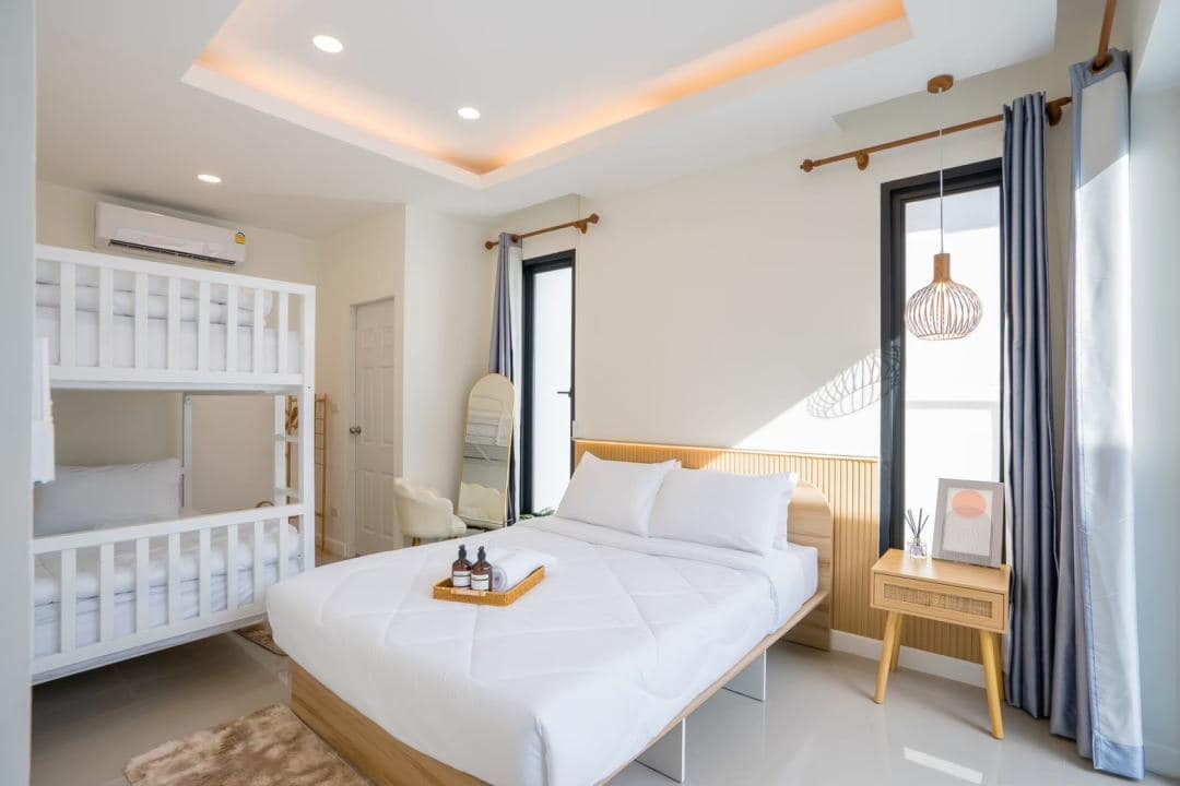 – ห้องนอนที่ 1 เตียงขนาด 5 ฟุต 1 เตียง และเตียงสองชั้นขนาด 3.5 ฟุต 1 เตียง